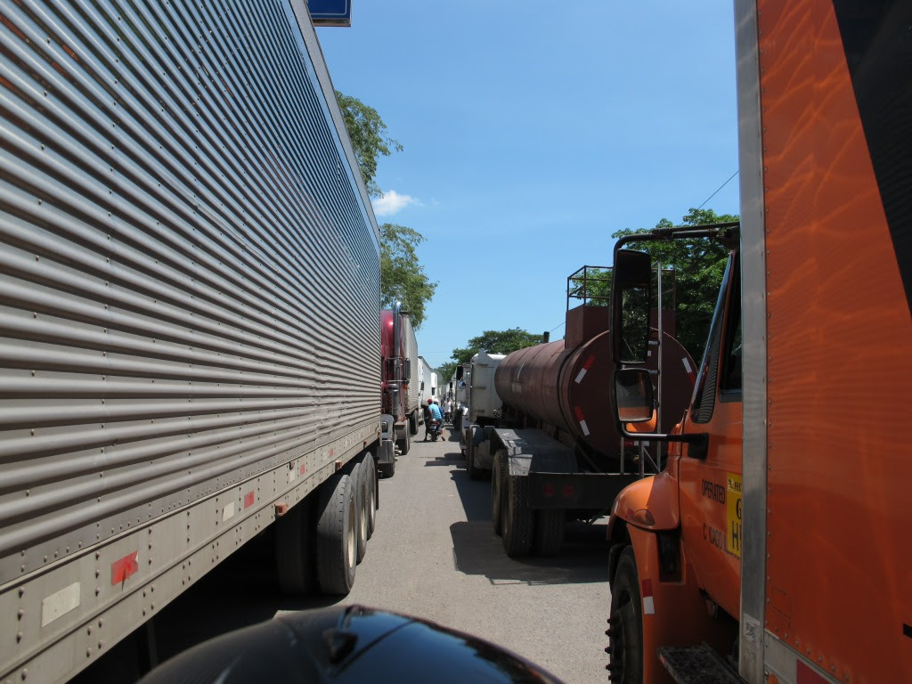 Then at the approach to the border. At least three km of trucks lined up. So what to do??? We ride down between them.
