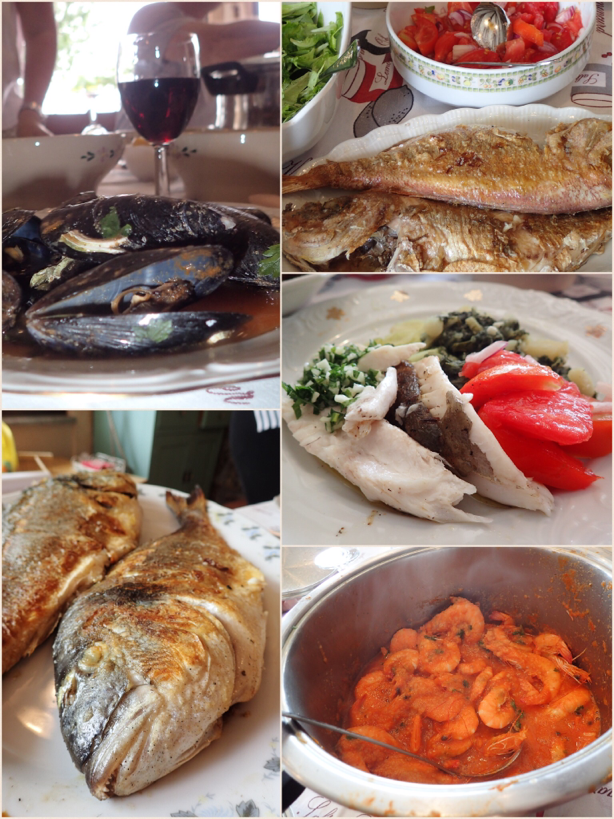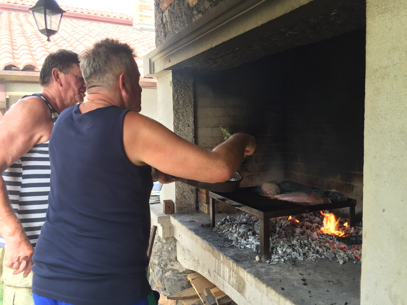 A wonderful feast of grilled fresh fish, buzara prawns and mussels, garlic, olive oil and herb pesto, salads, ripe tomatoes from the garden, grilled bread, wine from the grapes growing on the local slopes. Apple strudel to follow.
